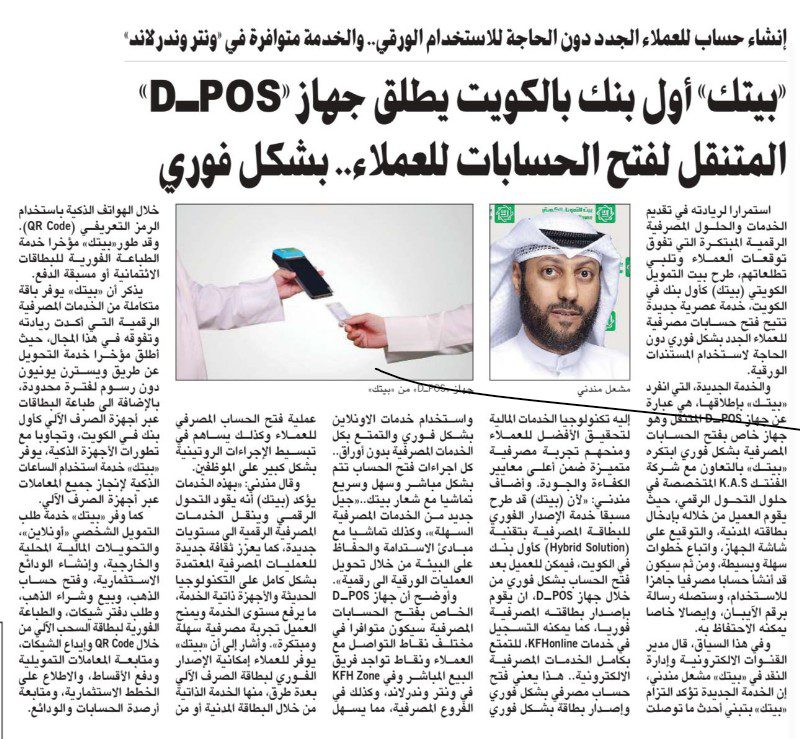 من الفكرة إلى التغطية الإعلامية – ابتكارٌ تصدّر عناوين الأخبار. نفخر بإعلان أن حل نقاط البيع الرقمية (D-POS) من بيت التمويل الكويتي، الذي طورته شركة K.A.S، قد ترك بصمته رسميًا – ليس فقط في القطاع المصرفي، بل أيضًا في أبرز الصحف الكويتية. يعكس هذا الإنجاز التزامنا بتحويل الأفكار إلى تقنيات فعّالة – حلولٌ لا تقتصر على الفعالية فحسب، بل تتميز أيضًا. مصممةٌ لغرضٍ محدد، مدعومةً بخبرة واسعة. اكتشف كيف نساعد مؤسساتٍ مثل بيت التمويل الكويتي على قيادة مستقبل الخدمات المصرفية الذكية.